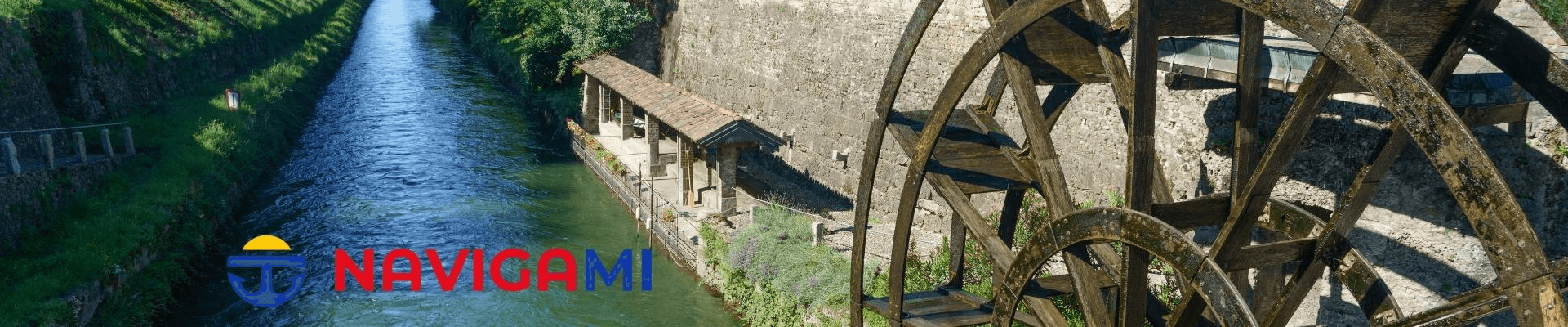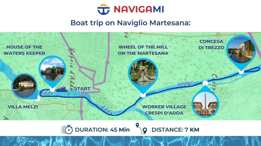 This one-way navigation on the Naviglio Martesana from Trezzo to Vaprio d’Adda lasts approximately 25 minutes.