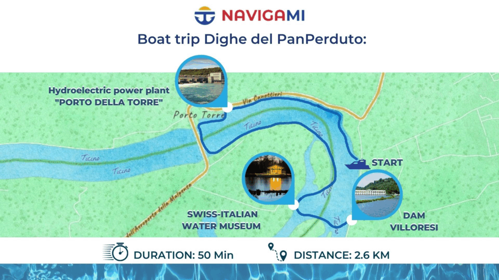 Continuing the 1300-meter route, on the Ticino river you reach the Porto della Torre barrage where the hydroelectric power station of the same name is located, located at the mouth of Lake Maggiore.